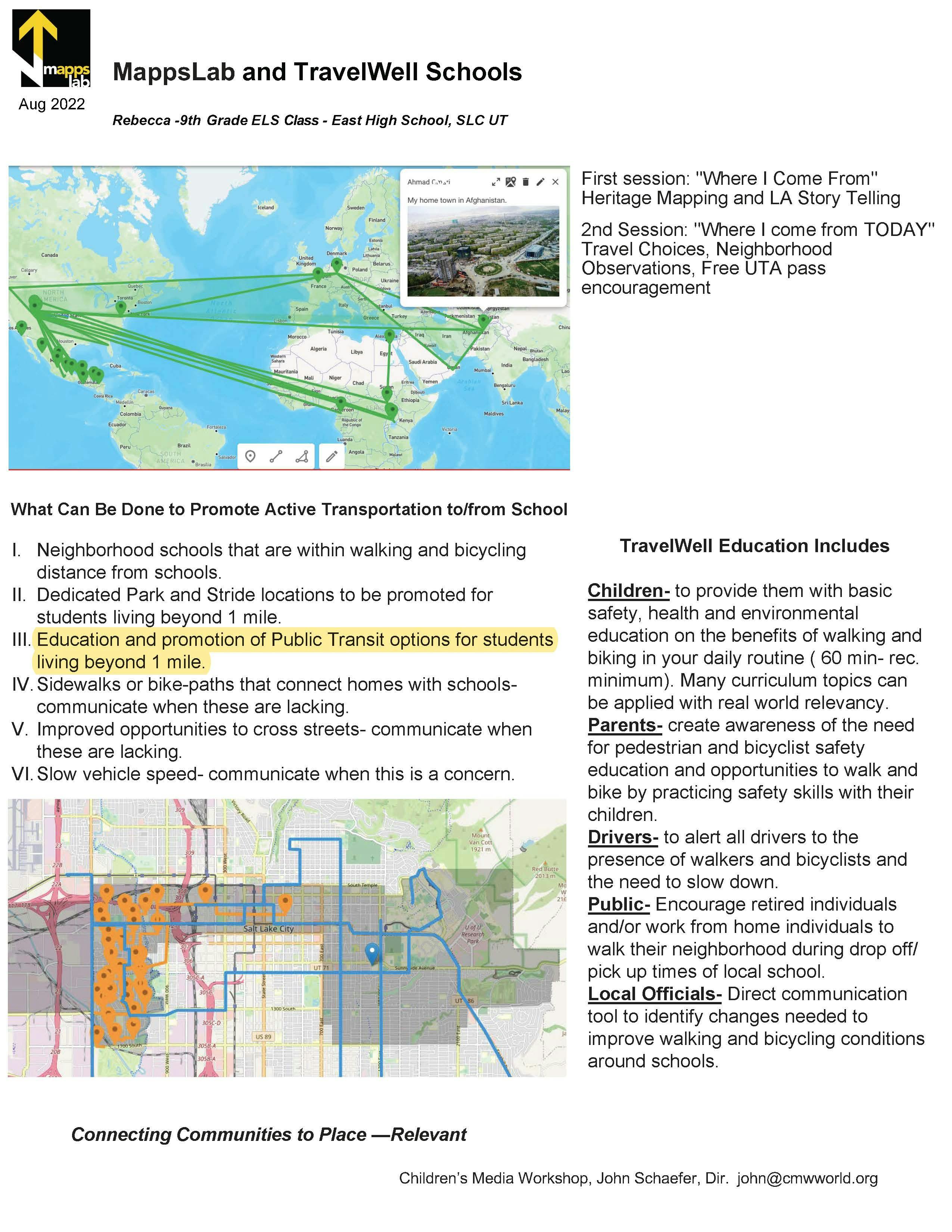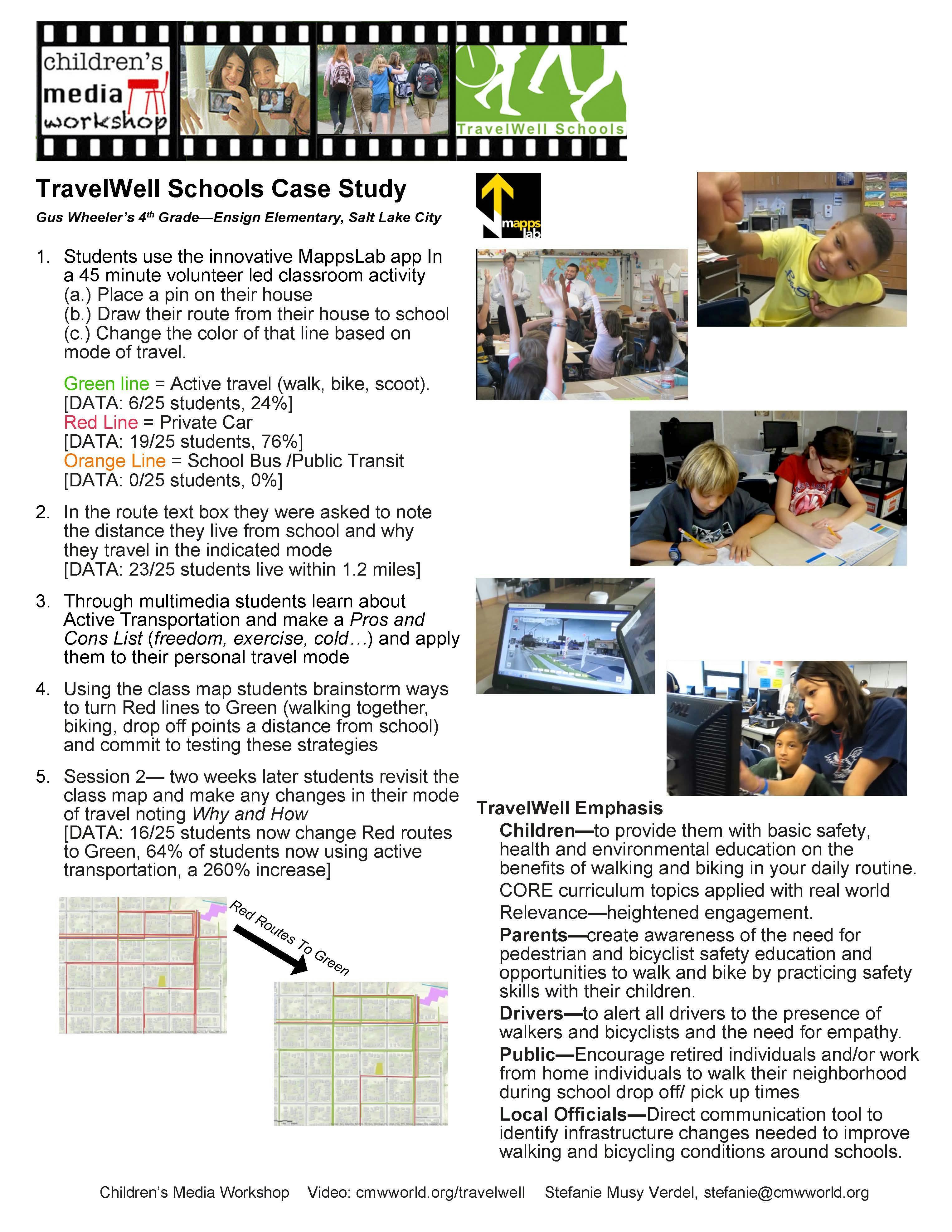 2011: An idea is born when UDOT's TravelWise program partnered with Children's Media Workshop and other community partners in collaboration with Utah schools to empower students and the community to make informed commuting decisions. Part of CMW's TravelWell program uses interactive mapping where students color code their routes to school. Students are informed and encouraged to change red ( private automobile trips) to green (active transportation trips).