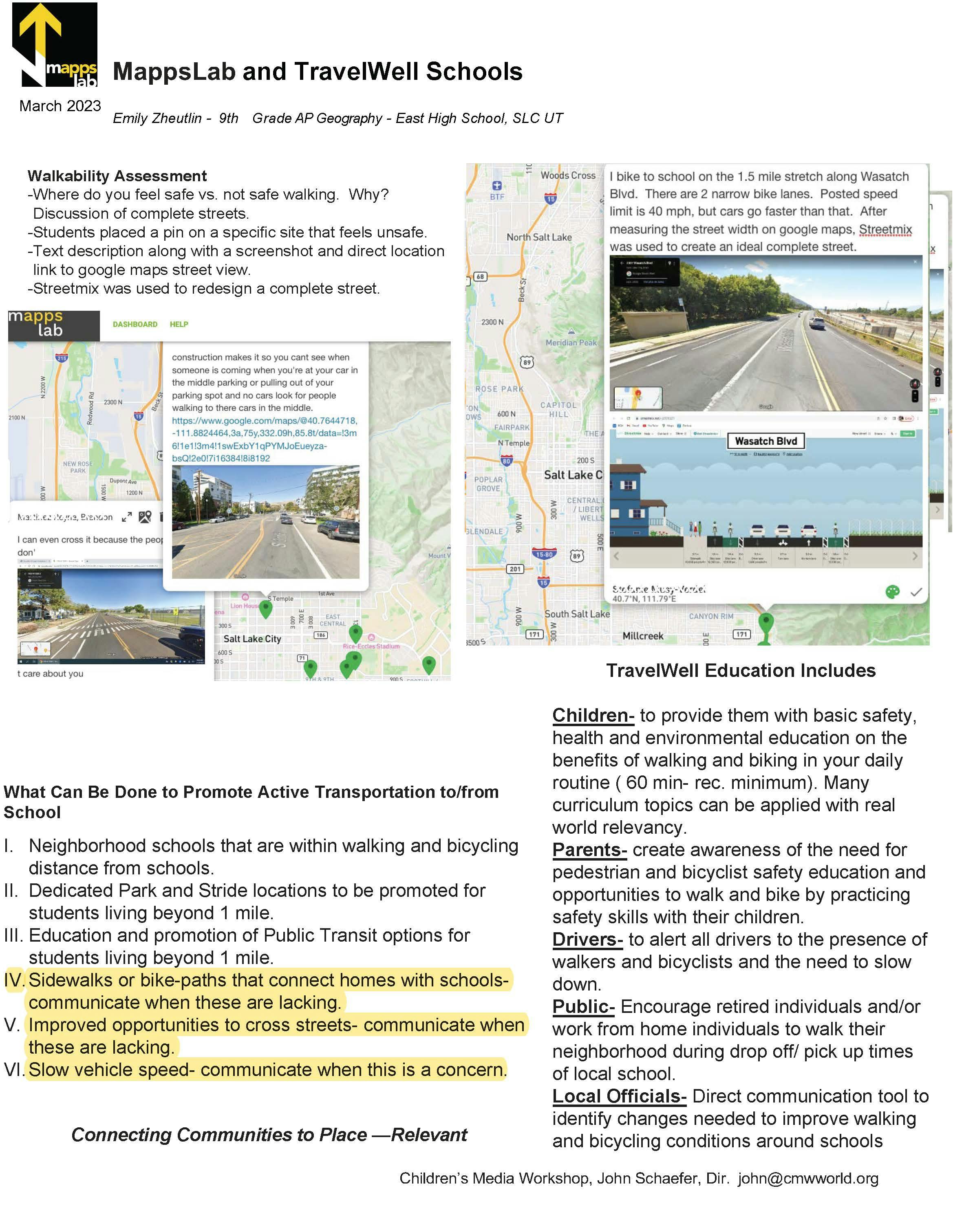 Neighborhood Dialogue including walkability, modes of transport, places of interest, places to gather, places to play. Story of place. Citizen Scientist. TravelWell Schools. Safety (opportunity to lead TravelWell Schools workshops for younger grades)